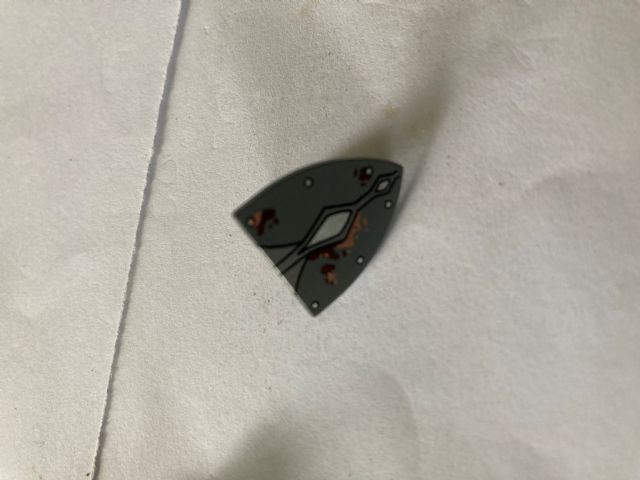 Minifigure, Shield Triangular Short with Silver Rivets and Diamonds, Rust and Dirt Stains Pattern