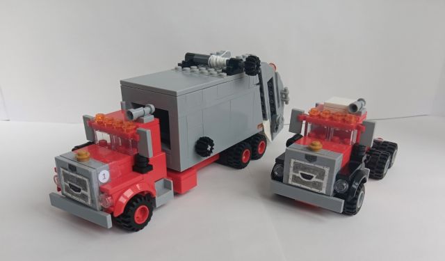 inspiration from a Lego garbage truck on YouTube. And the tractor truck is a