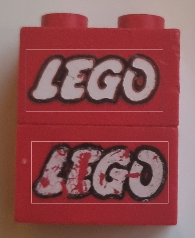 I have to 1 x 2 red decorated bricks with 'LEGO' printed on them as seen