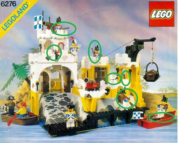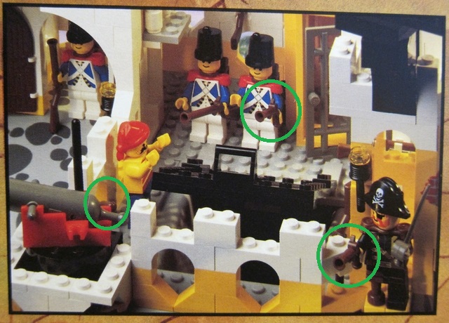 One of the flintlocks is used in step 22, but later in the instructions this is obscured by a cannon. The other 2 flintlocks are being held by figures in the final instruction image (step 24)
