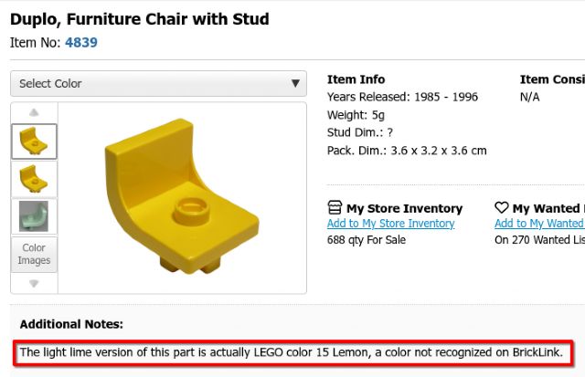 If BrickLink is going to note that some pieces are in lemon (ie. 4839), why don't