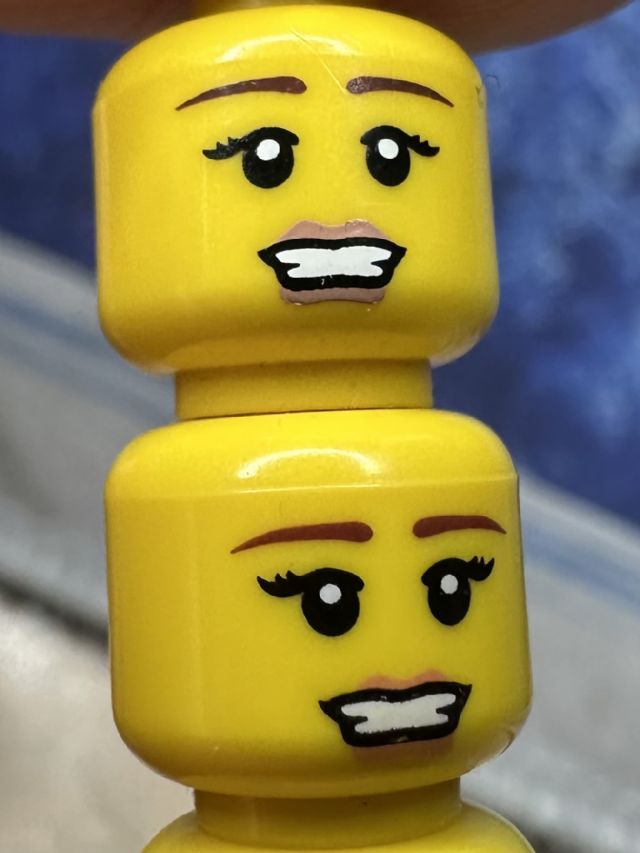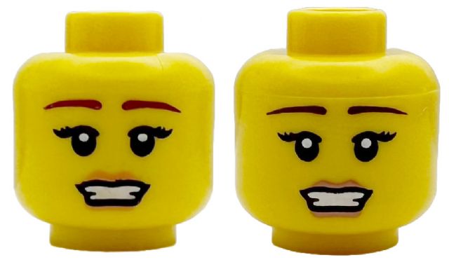3626pb0439 Minifigure, Head Female Reddish Brown Thin Eyebrows, Black Long Eyelashes, Nougat Lips, Open Mouth Smile with Teeth Pattern Parts: Minifigure, Head {Yellow}
