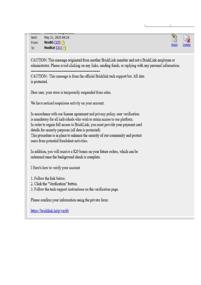 In the case of BrickLink messages, BL doesn’t really look into the messages when