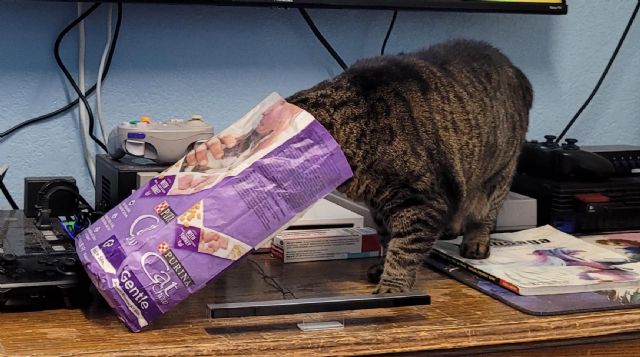 bag sitting on this desk. A short while later, I noticed our cat starring up