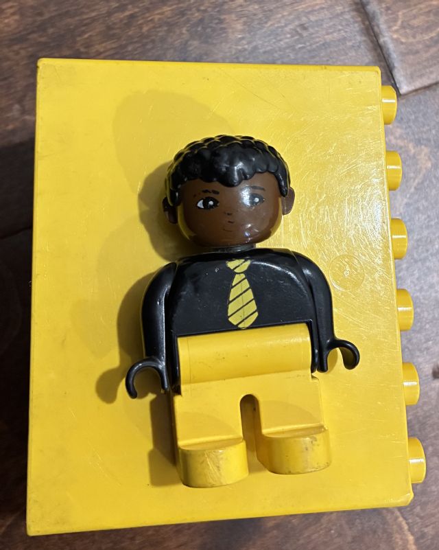 * |  | 4555pb224 Duplo Figure, Male, Yellow Legs, Black Top and Yellow Striped Tie, Black Curly Hair, Brown Head Minifigures: DUPLO |