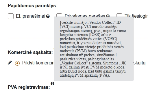 "Įveskite siuntėjo „Vendor Collect“ ID (VCI) numerį. VCI nurodo siuntėjo