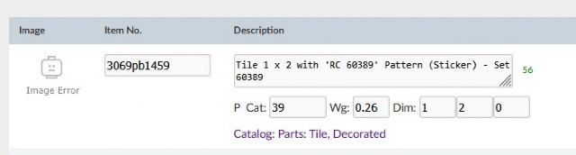 piece 3069pb1459 is supposed to be titled "Tile 1 x 2 with 'RC 60389'