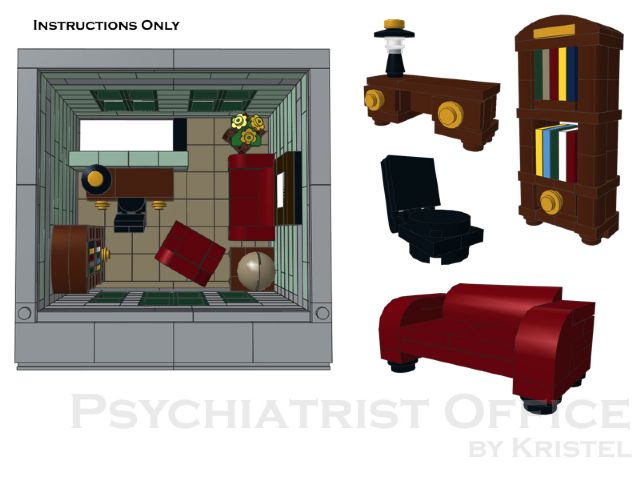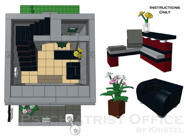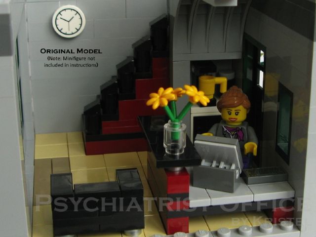| Home - Apple Square University - Bed & Breakfast - Beloved Belle - Black Velvet - Blooming Blossoms - Blue Shores - Cast Iron Modular - Coveted Clutch - Ferris Wheel - Fountain Castle - Green Gables Stadium - Lawyer's Laundromat - Lion Heart Hotel - MedCo Clinic - Museum of Natural History - Princess Palace - Psychiatrist Office - Pumpkin Factory - Sugar & Spice - Tan Townhouse - Townhouse No.2 - Townhouse No.2b - Trilogy - Winter Barn House - Winter Cafe | Psychiatrist OfficeExtend your town layout with the step-by-step instructions for the 1,200+ pieces, 16-stud wide modular medical practice. It features a fully furnished interior, with a reception area on the ground floor and the doctor's office on the first floor. This design is based on an MOC originally built in real LEGO bricks and has been rebuilt using the instructions to confirm the building steps and the parts required.