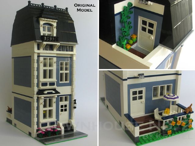 Additional pictures of the original building, including the interior, can be found on my flickr stream here. This design is very true to the original model, with only minor changes. For example, the original model had mixed dark pink, bright pink and white flowers in the front garden. This model uses only bright pink and white. Note: The instructions uses 1x2 bricks in Sand Blue , which can be difficult to source cheaply. The original model was built using 1x2 bricks with groove (Item ID 4216), with the groove towards the inside of the building. These are more readily available. | ||