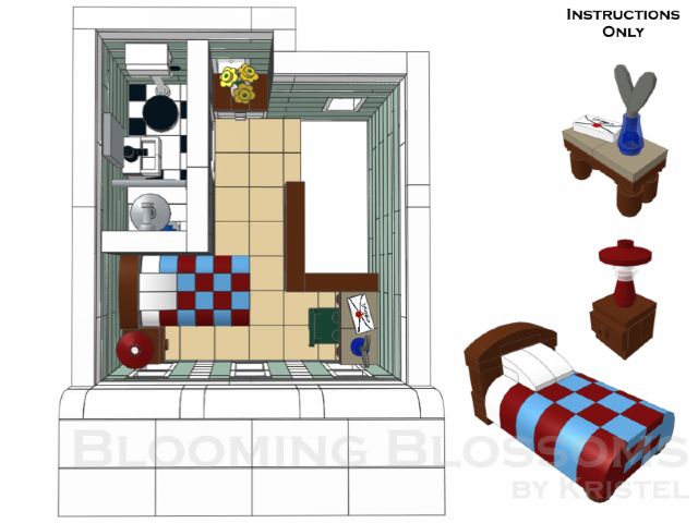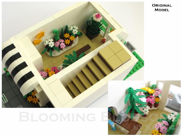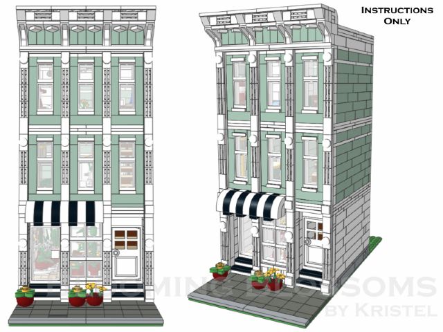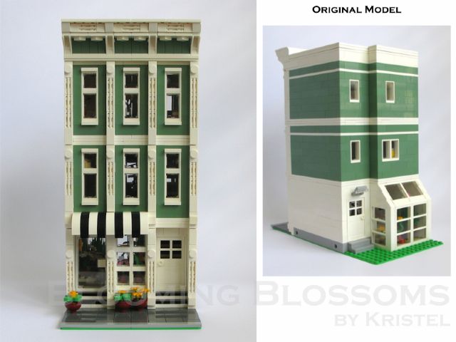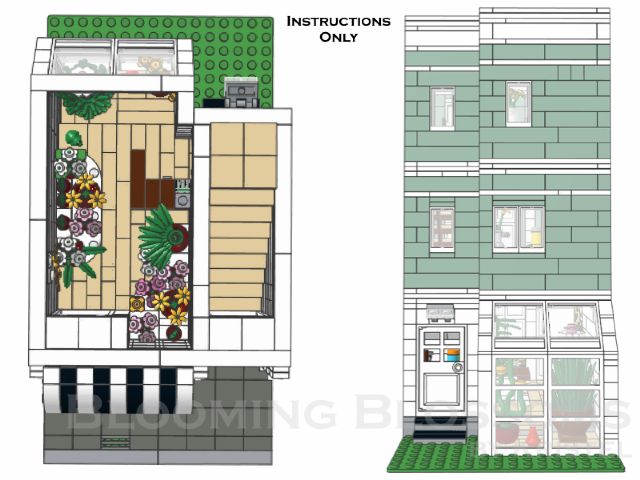 | Home - Apple Square University - Bed & Breakfast - Beloved Belle - Black Velvet - Blooming Blossoms - Blue Shores - Cast Iron Modular - Coveted Clutch - Ferris Wheel - Fountain Castle - Green Gables Stadium - Lawyer's Laundromat - Lion Heart Hotel - MedCo Clinic - Museum of Natural History - Princess Palace - Psychiatrist Office - Pumpkin Factory - Sugar & Spice - Tan Townhouse - Townhouse No.2 - Townhouse No.2b - Trilogy - Winter Barn House - Winter Cafe | Blooming BlossomsExtend your town layout with the step-by-step instructions for the 1,500+ pieces, 16-stud wide modular building, Blooming Blossoms. Named after the florist on the ground floor and features a fully furnished interior. There is an apartment of the upper floors, with the combined lounge and kitchen on the first floor, and bedroom and bathroom on the top floor. There's a small garden room out the back for the exotics sold by the florist. This design is based on an MOC originally built in real LEGO bricks and has been rebuilt using the instructions to confirm the building steps and the parts required.
