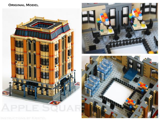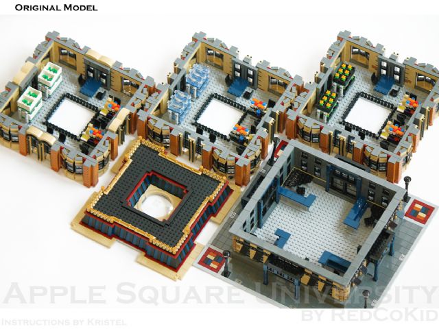 | Home - Apple Square University - Bed & Breakfast - Beloved Belle - Black Velvet - Blooming Blossoms - Blue Shores - Cast Iron Modular - Coveted Clutch - Ferris Wheel - Fountain Castle - Green Gables Stadium - Lawyer's Laundromat - Lion Heart Hotel - MedCo Clinic - Museum of Natural History - Princess Palace - Psychiatrist Office - Pumpkin Factory - Sugar & Spice - Tan Townhouse - Townhouse No.2 - Townhouse No.2b - Trilogy - Winter Barn House - Winter Cafe | Apple Square UniversityThe Apple Square University is a 7,905 piece custom modular building designed by RedCoKid. It has four fully furnished levels, with the university's administration functions on the ground floor and biology research labs on the upper three levels. This design is based on an MOC originally built in real LEGO bricks and has been rebuilt using the instructions to confirm the building steps and the parts required.