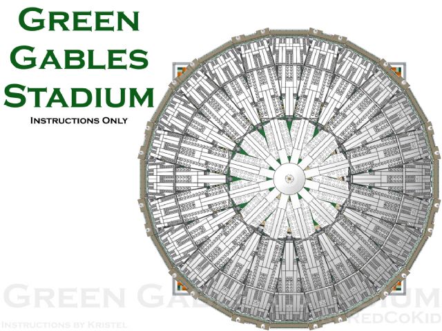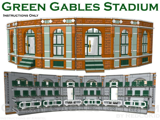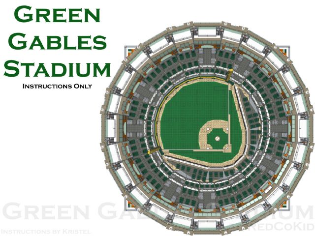 | Home - Apple Square University - Bed & Breakfast - Beloved Belle - Black Velvet - Blooming Blossoms - Blue Shores - Cast Iron Modular - Coveted Clutch - Ferris Wheel - Fountain Castle - Green Gables Stadium - Lawyer's Laundromat - Lion Heart Hotel - MedCo Clinic - Museum of Natural History - Princess Palace - Psychiatrist Office - Pumpkin Factory - Sugar & Spice - Tan Townhouse - Townhouse No.2 - Townhouse No.2b - Trilogy - Winter Barn House - Winter Cafe | Green Gables StadiumThe Green Gables Stadium is one of RedCoKid’s award winning models, having won the “Best Large Building” category at Brickworld 2013 in Chicago. Sitting on four 48x48 baseplates, the Green Gables Stadium is an 18,600+ part custom model and comprises eight stadium modules, the roof and the baseball field. Optional stadium signage and an alternative football field are also included in the instructions. This design is based on an MOC originally built in real LEGO bricks and has been rebuilt using the instructions to confirm the building steps and the parts required.