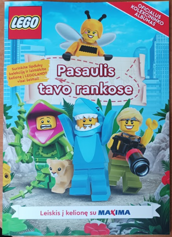 * This is from an event, in which the Lego Group and the Maxima Group (a retail chain company), where you have to collect 2 types of stickers to win different prizes. The first type you get for your shopping list amount in intervals of 15 Euro, are small stickers you put on a paper flyer, which when you get 5 of, you can redeem it for a discount on various Lego products, the second type you get for purchasing specifically marked products, that come in packs of four, are stickers for the aforementioned collectors book, where you need to collect 96 different stickers and once you collect them all, 10 people with the completed book will get free tickets to Legoland Billund for their whole family.