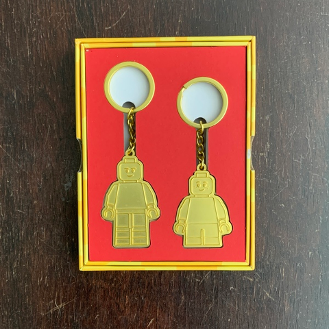 * This is a box with 2 key chains metallic on gold color; one (adult minifigure) whit "best dad" reference and the LEGO logo in the back of the key chain and the another (child minifigure) only with the LEGO logo