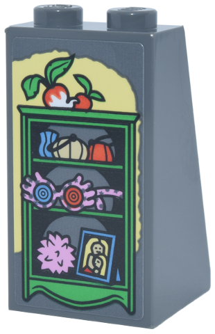 Slope 75 2 x 2 x 3 - Solid Studs with Bright Green Shelf with Framed Portrait, Radishes, Bright Pink Glasses and Pygmy Puff on Bright Light Yellow Background Pattern (Sticker) - Set 76467