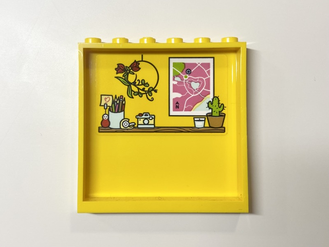 Panel 1 x 6 x 5 with Medium Nougat Shelf with Pencil Pot, Camera, Tape Dispenser, Candle, Potted Cactus, Heartlake City Wall Map and Hanging Band with Red Flowers on Yellow Background Pattern (Sticker) - Set 41704