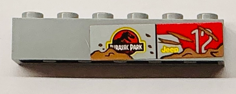 Light Bluish Gray Brick 1 x 6 With Jurassic World logo, jeep in yellow, #12 in light bluish gray on red background with mud splattered (sticker) - Set 76958